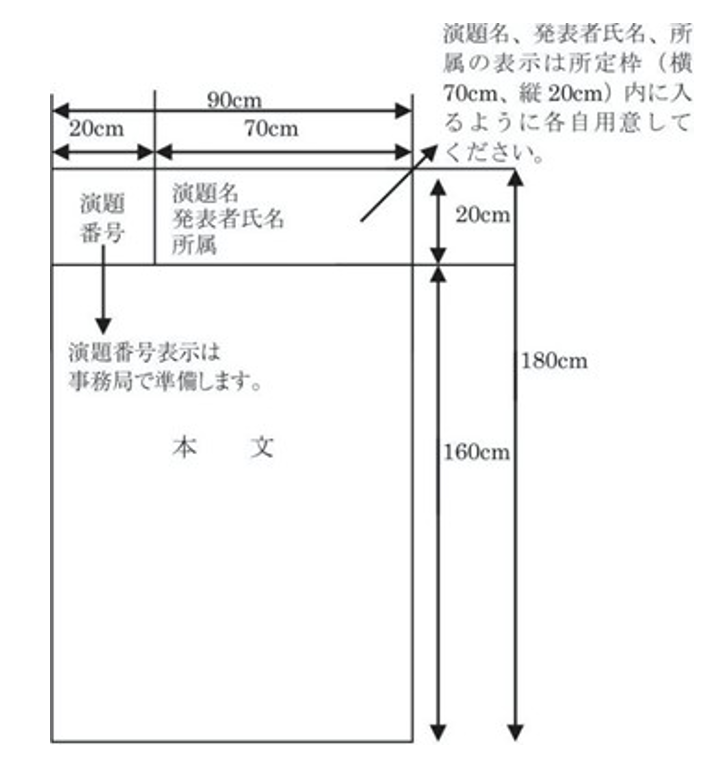 - 演題名、発表者名、所属の表示(幅70cm × 高さ20cm)は、各自でご準備ください。掲示に必要な押しピンは事務局で用意いたします。